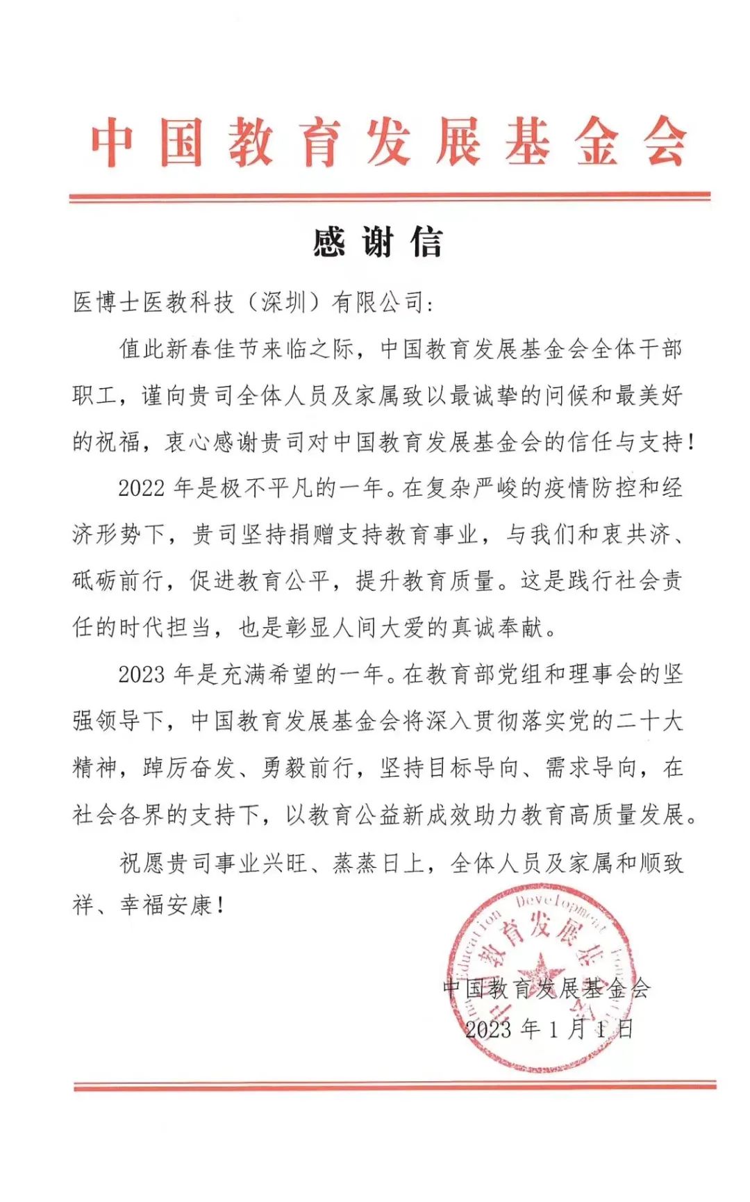 一封來自中國教育發(fā)展基金會(huì)的感謝信,醫(yī)博士2022年前行的見證